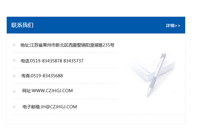 地址:常州市新北區友邦商務大廈1幢16、17層  電話:0519-85101652  傳真:0519-85112595  郵編:213022  網址:www.cz-jiayue_cn.ohxny.com  郵箱:xiajifengaa@163.com